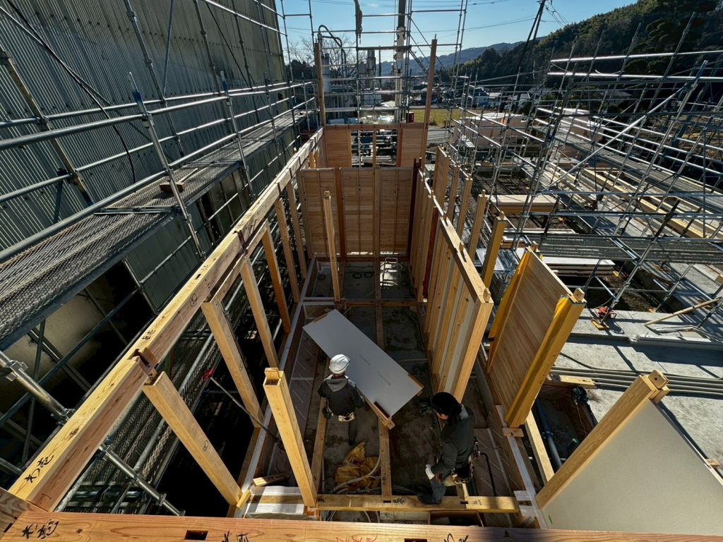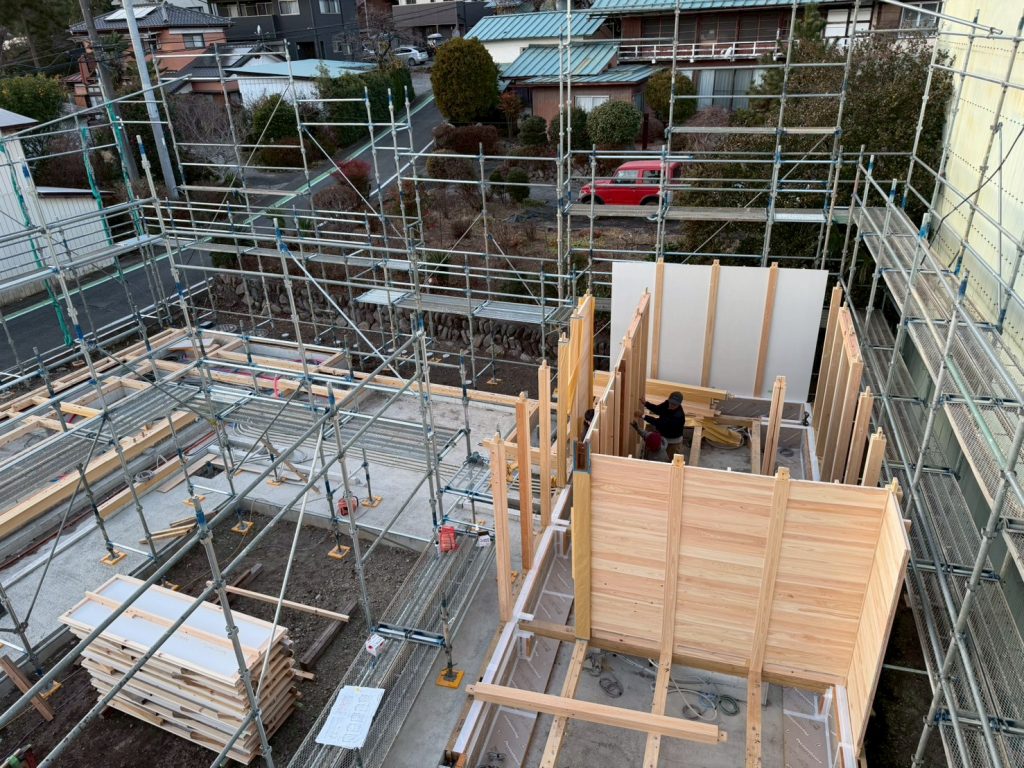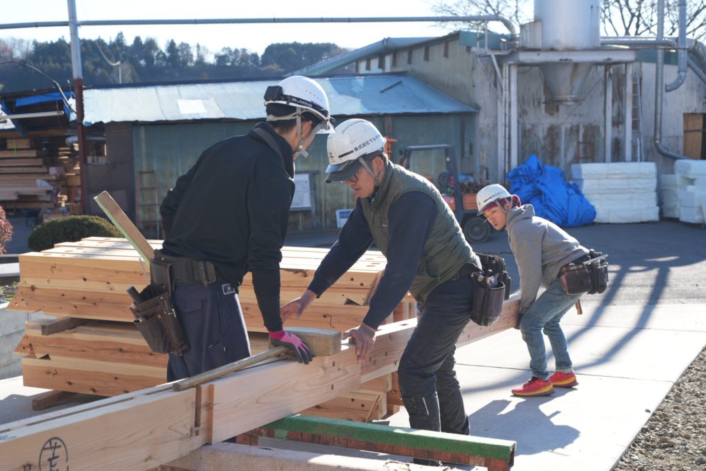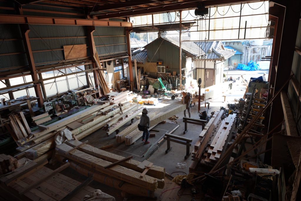 それらの材料が数日で一気に家のかたちに姿を変え、久しぶりに加工場の奥まで見えた時、