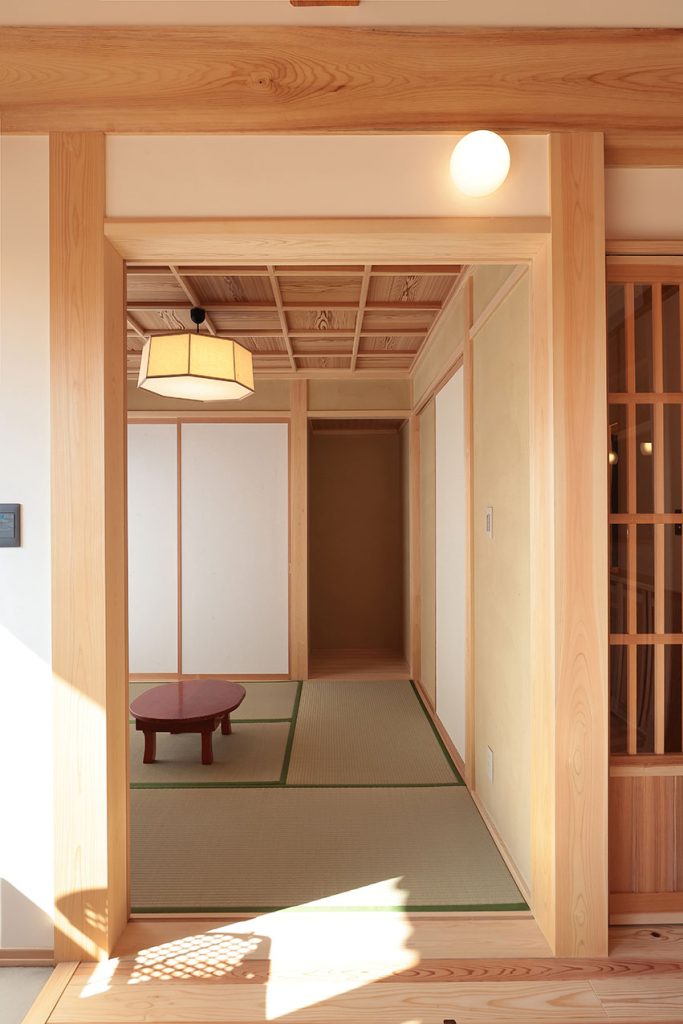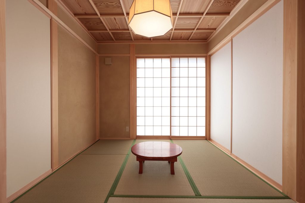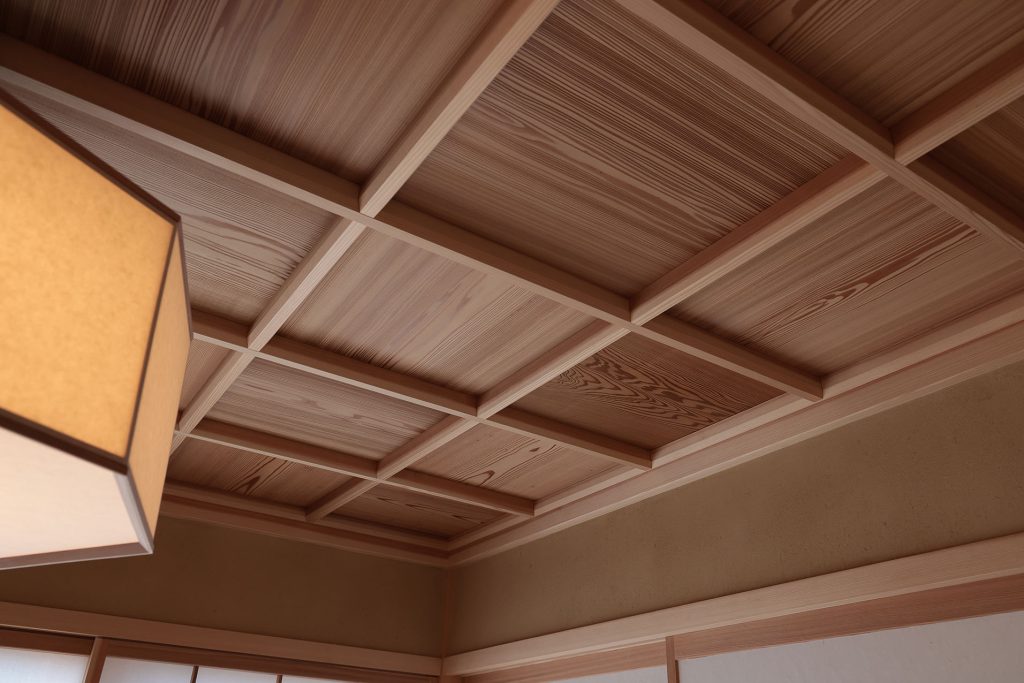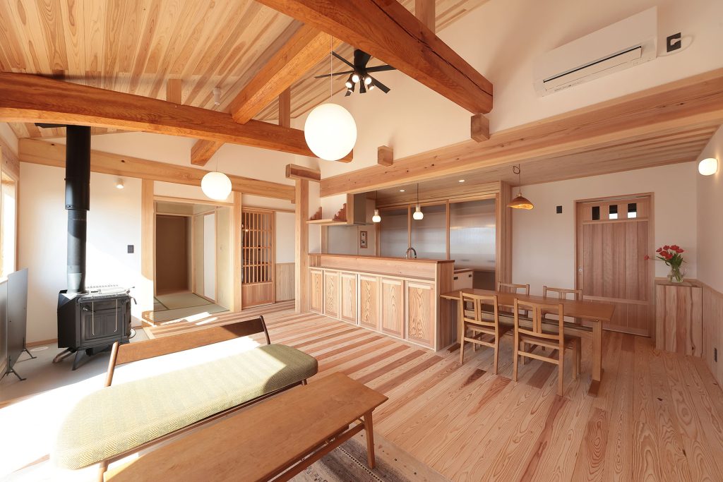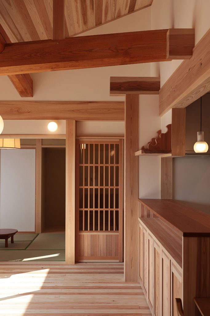 焼杉×漆喰和瓦に鬼瓦をのせた落ち着きと品のある和の佇まい赤松の現しの梁組みが目を引くのびやかな空間玄関と和室には格天井をしつらえ、住まいの要所に日本の住文化を感じられるつくり。